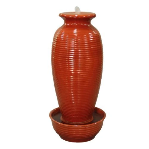 This striking water feature, with a unique shape, rippled design and a stunning terracotta orange colour, brings a touch of tranquillity and stands out in any garden. The water gently flows down the vase shape and back into the base of the self contained water feature, so it does not require any plumbing. It is a mains powered water feature with integrated LED lights and made from ceramic material.
