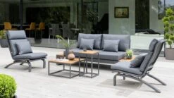 With the LIFE Soho Lounge Set you can enjoy a modern design combining the aluminium frame with the teak arm rests. The entire range comes in our most popular colour combination of Lava frame with the soft touch All Weather Carbon cushions.